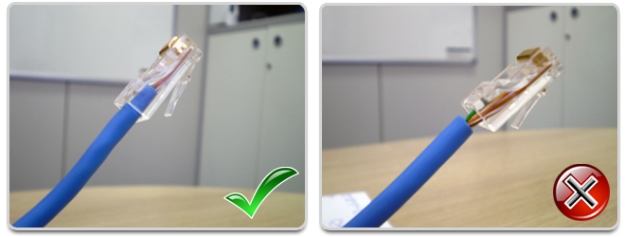 Não deixe que os fios coloridos fiquem para fora. A capa do cabo deve ficar dentro do conector RJ-45, quase até a metade do conector. Se isso não ocorrer, diminua o tamanho dos fios internos até que isso ocorra. Observe as fotos abaixo e veja como seu cabo deverá ficar ao final do processo.