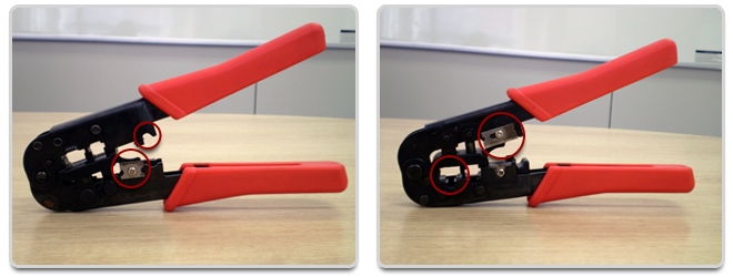 Antes de iniciar, observe o alicate de crimpagem. Nele, existem dois tipos de guilhotinas: uma para desencapar os cabos e outra para aparar os fios. Em alguns casos, existe um sulco no qual o cabo deve ser inserido para ser descascado. Existe também um conector no qual serão crimpados os conectores RJ-45.
